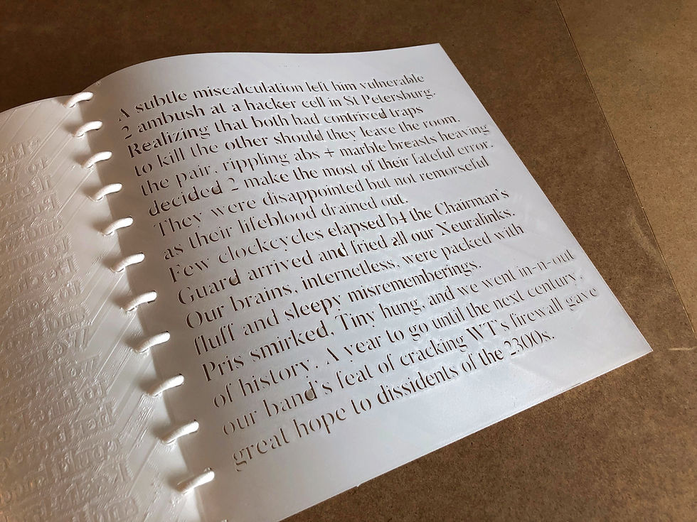 We are indebted to KMBond for the overall concept and an MIT Media Lab study for showing the potential of one-layer prints. During testing we found that 0.2 mm layer sheets were even sturdier than paper pages. The limiting factors for page design were printer extruder precision and font.
